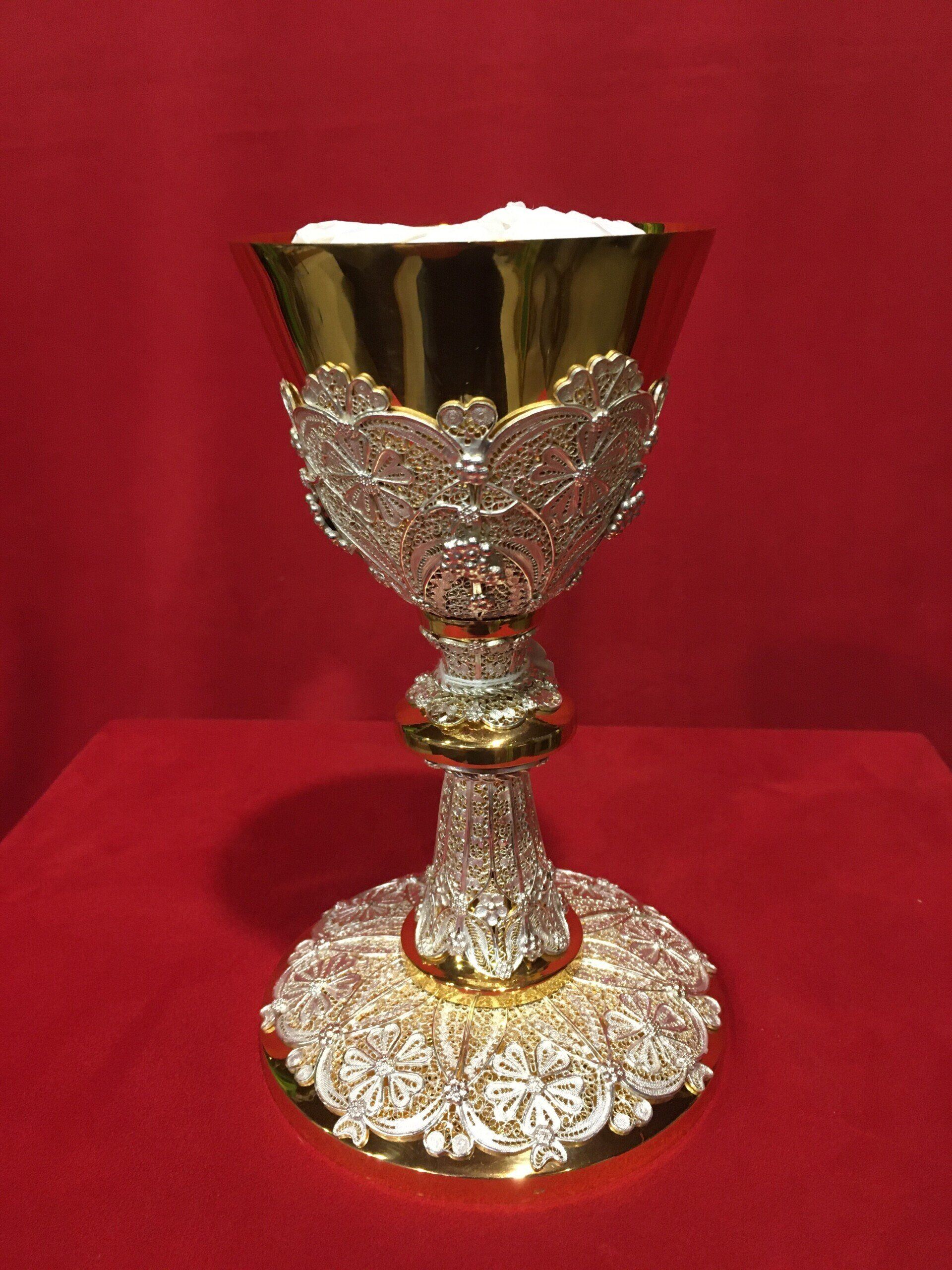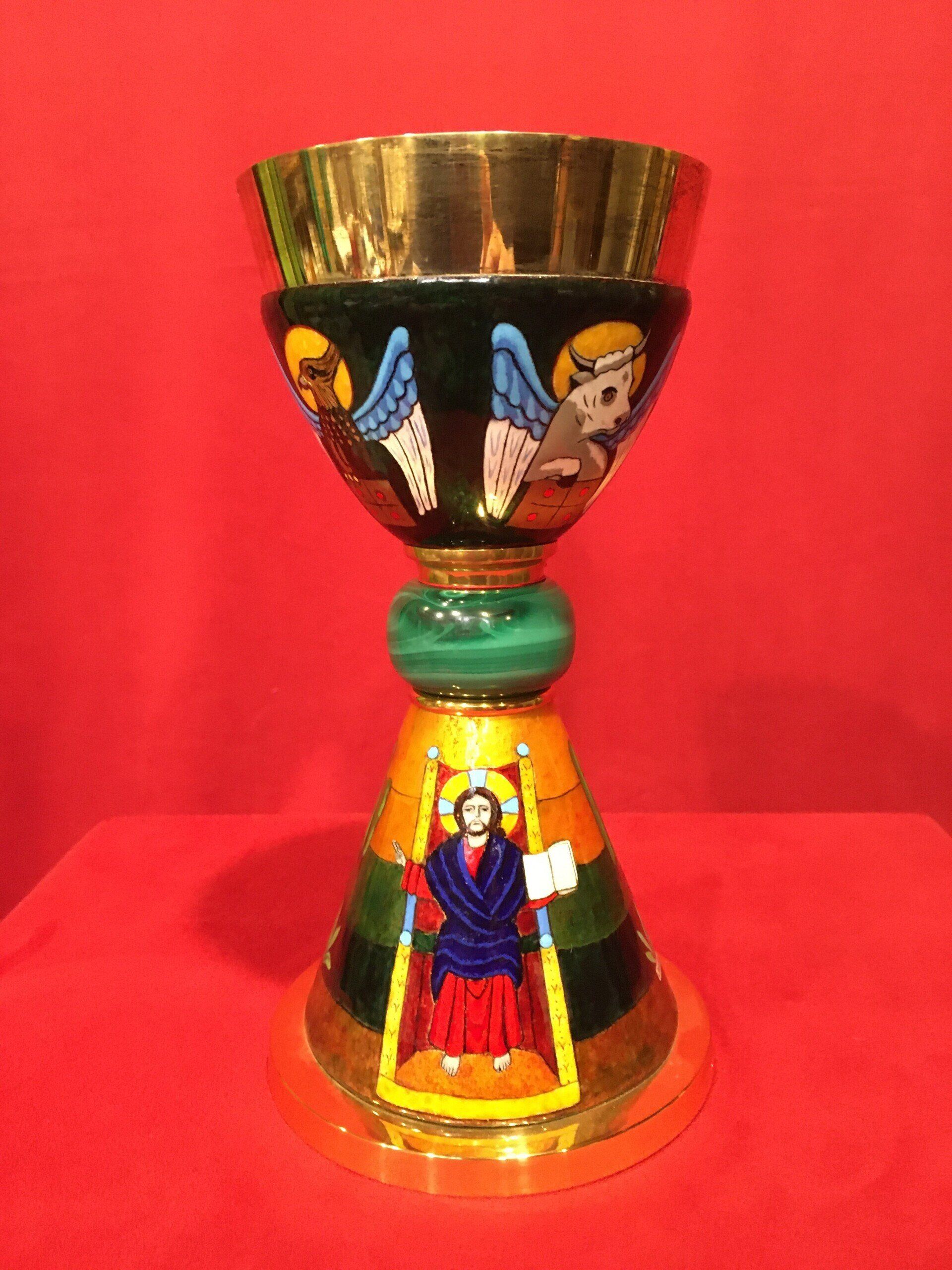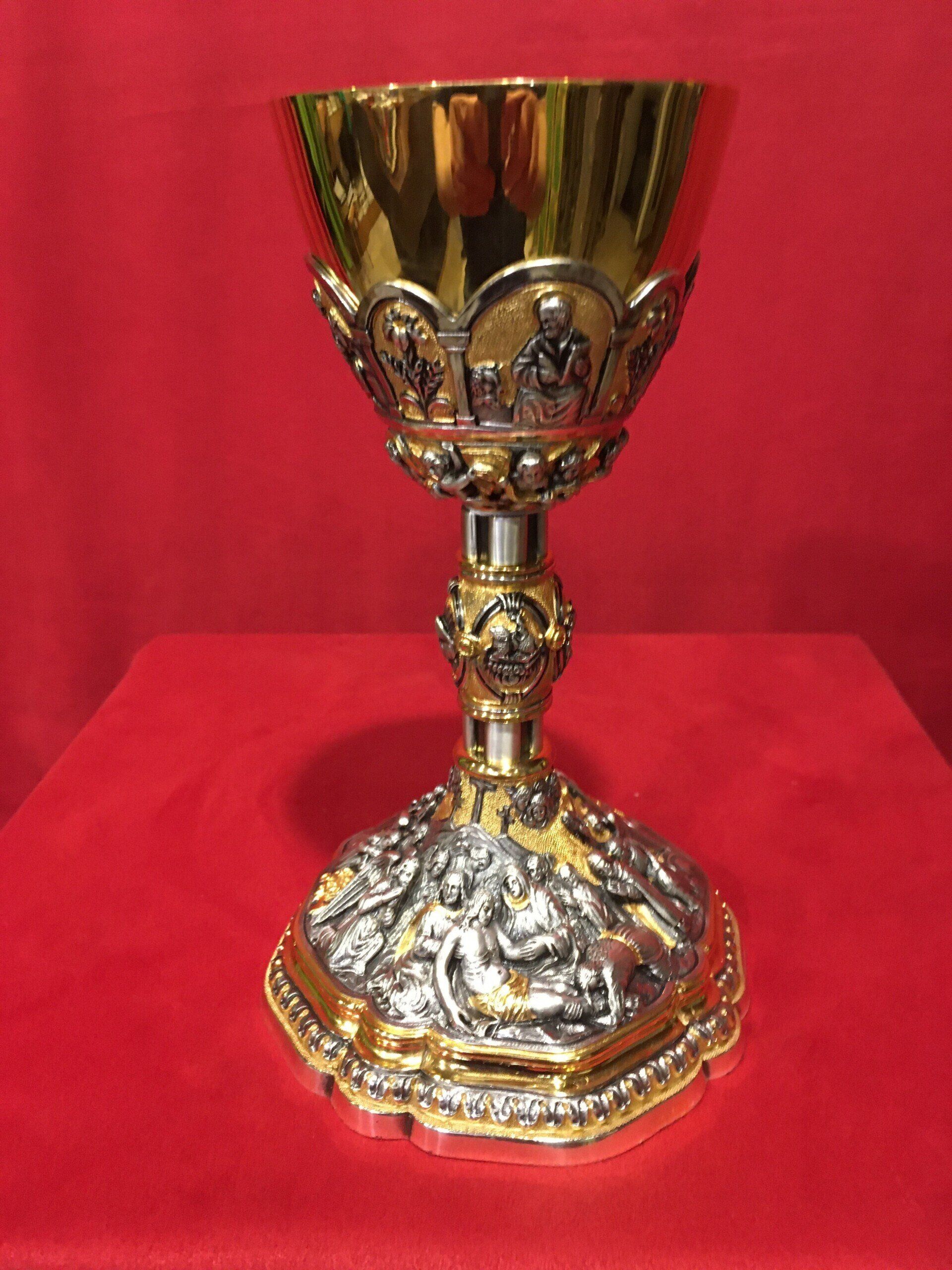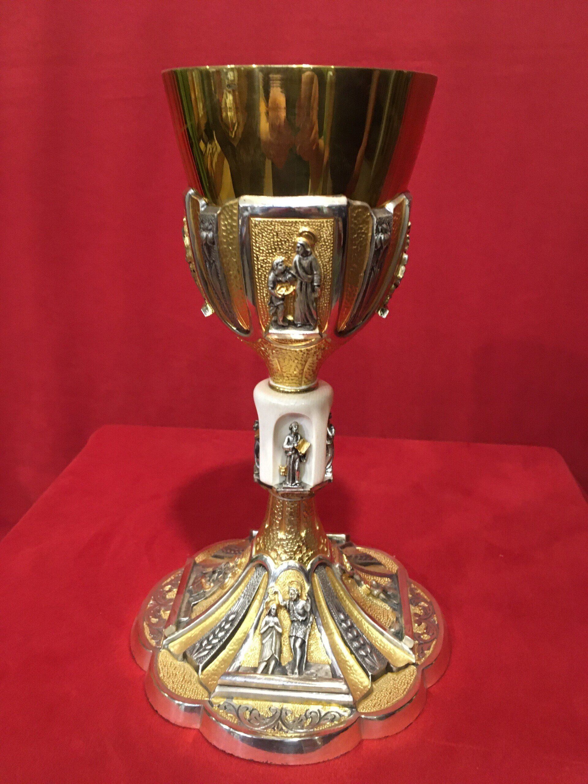 Il calice si sviluppa su un'altezza totale di cm 20 con una coppa in argento dorato oro zecchino dal diametro di 10.5 cm. Sul piede aureo della base, una scritta in caratteri greci su smalto bianco riporta le parole del Signore: "lo sono la vite e voi i tralci". (Gv. 15, 5a) Sul collo della base, tra loro contrapposti, adagiati su uno sfondo smaltato, cinque pani e un grappolo d'uva, frutto della terra e del lavoro dell'uomo, sono pronti per essere offerti per il sacrificio spirituale a Dio gradito. Un nodo con tre ordini di semisfere congiunge e distingue la base della coppa.