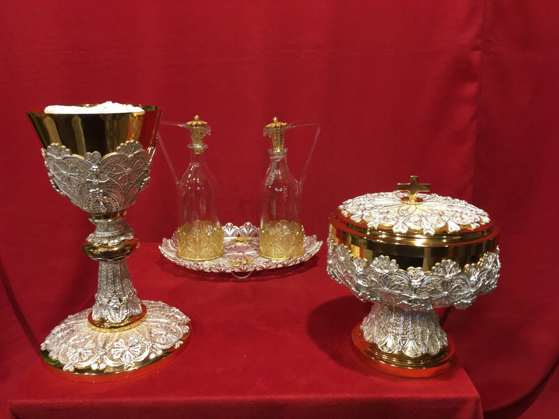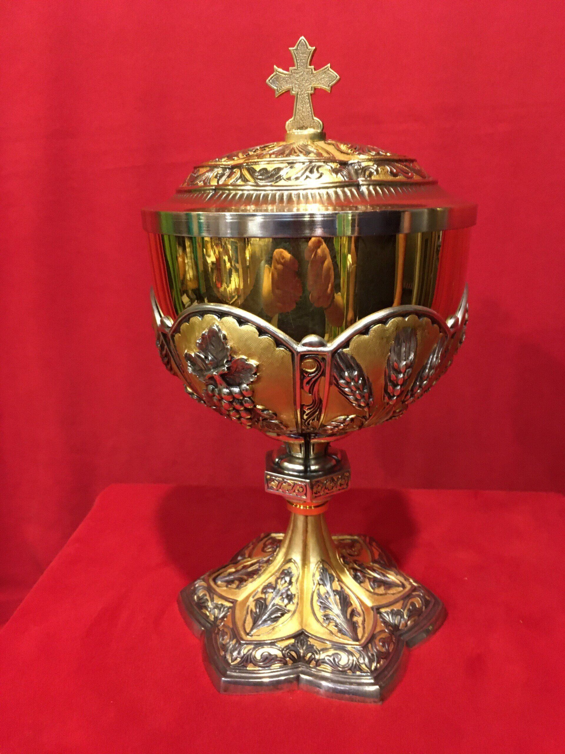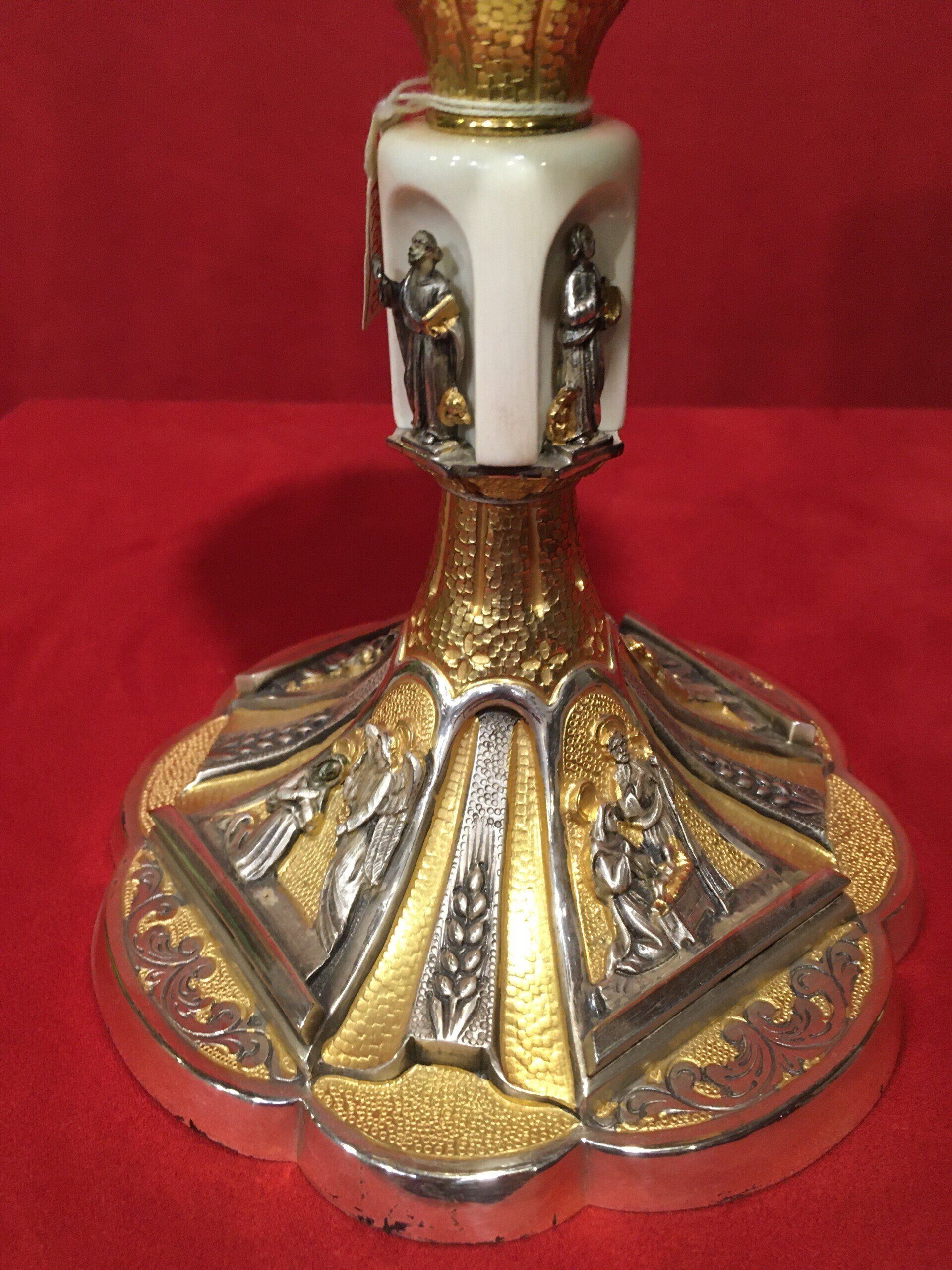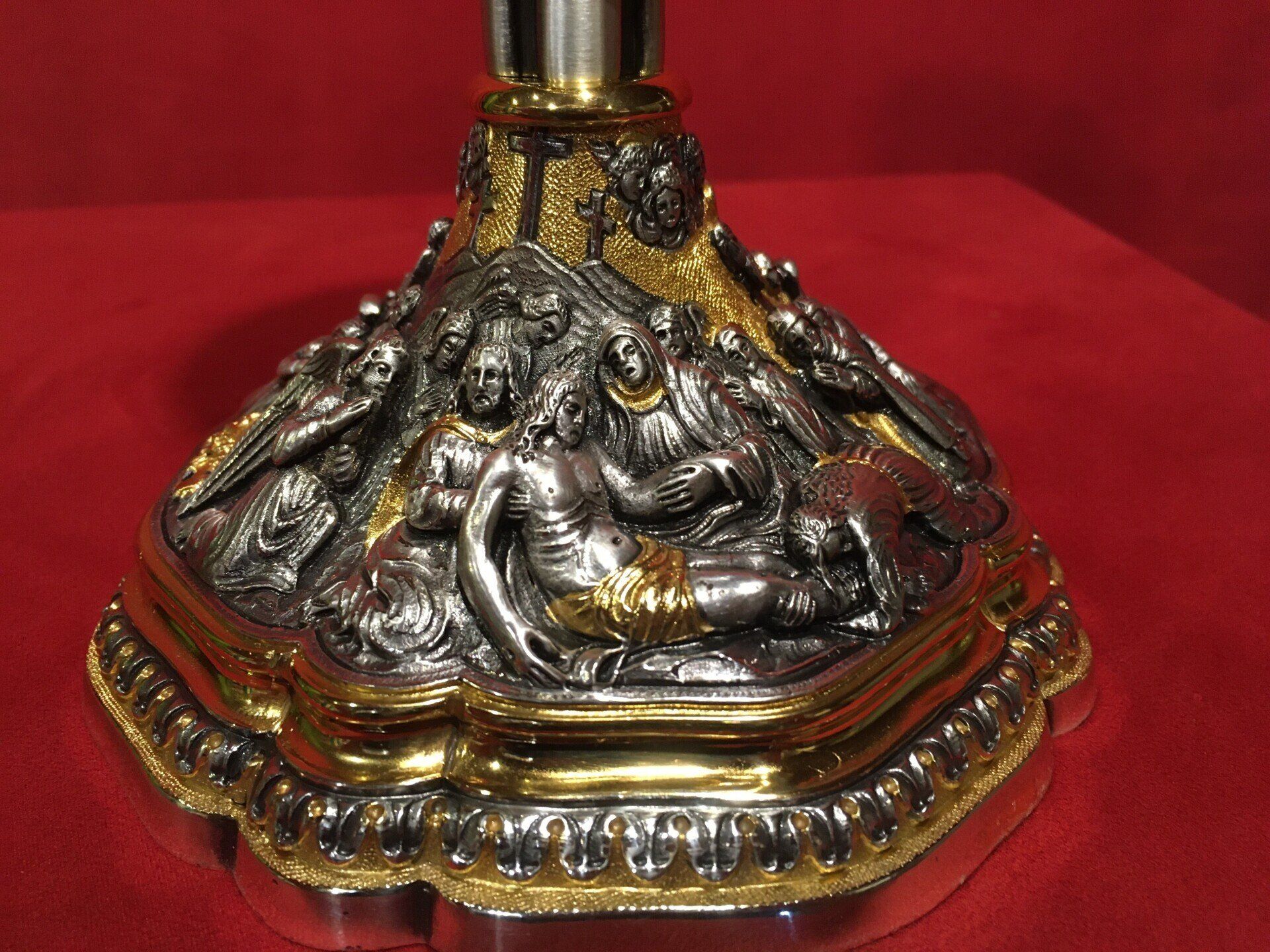 Il calice si sviluppa su un'altezza totale di cm 20 con una coppa in argento dorato oro zecchino dal diametro di 10.5 cm. Sul piede aureo della base, una scritta in caratteri greci su smalto bianco riporta le parole del Signore: "lo sono la vite e voi i tralci". (Gv. 15, 5a) Sul collo della base, tra loro contrapposti, adagiati su uno sfondo smaltato, cinque pani e un grappolo d'uva, frutto della terra e del lavoro dell'uomo, sono pronti per essere offerti per il sacrificio spirituale a Dio gradito. Un nodo con tre ordini di semisfere congiunge e distingue la base della coppa.