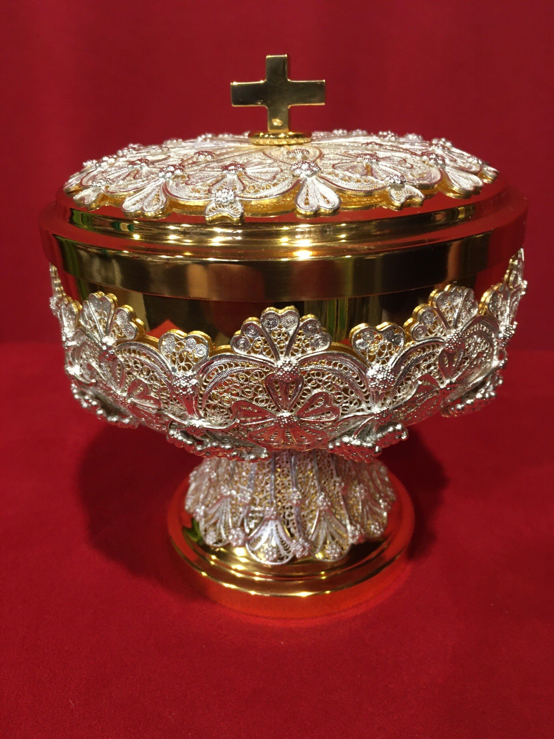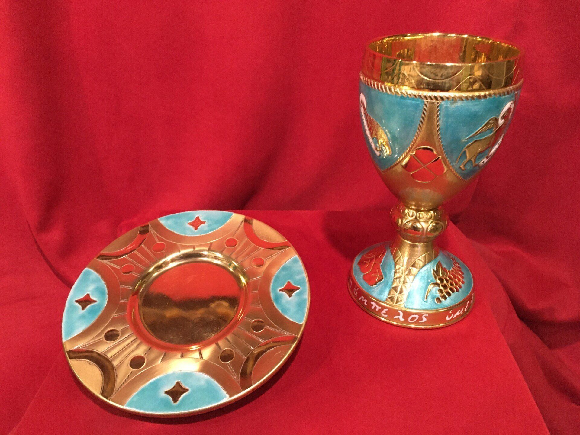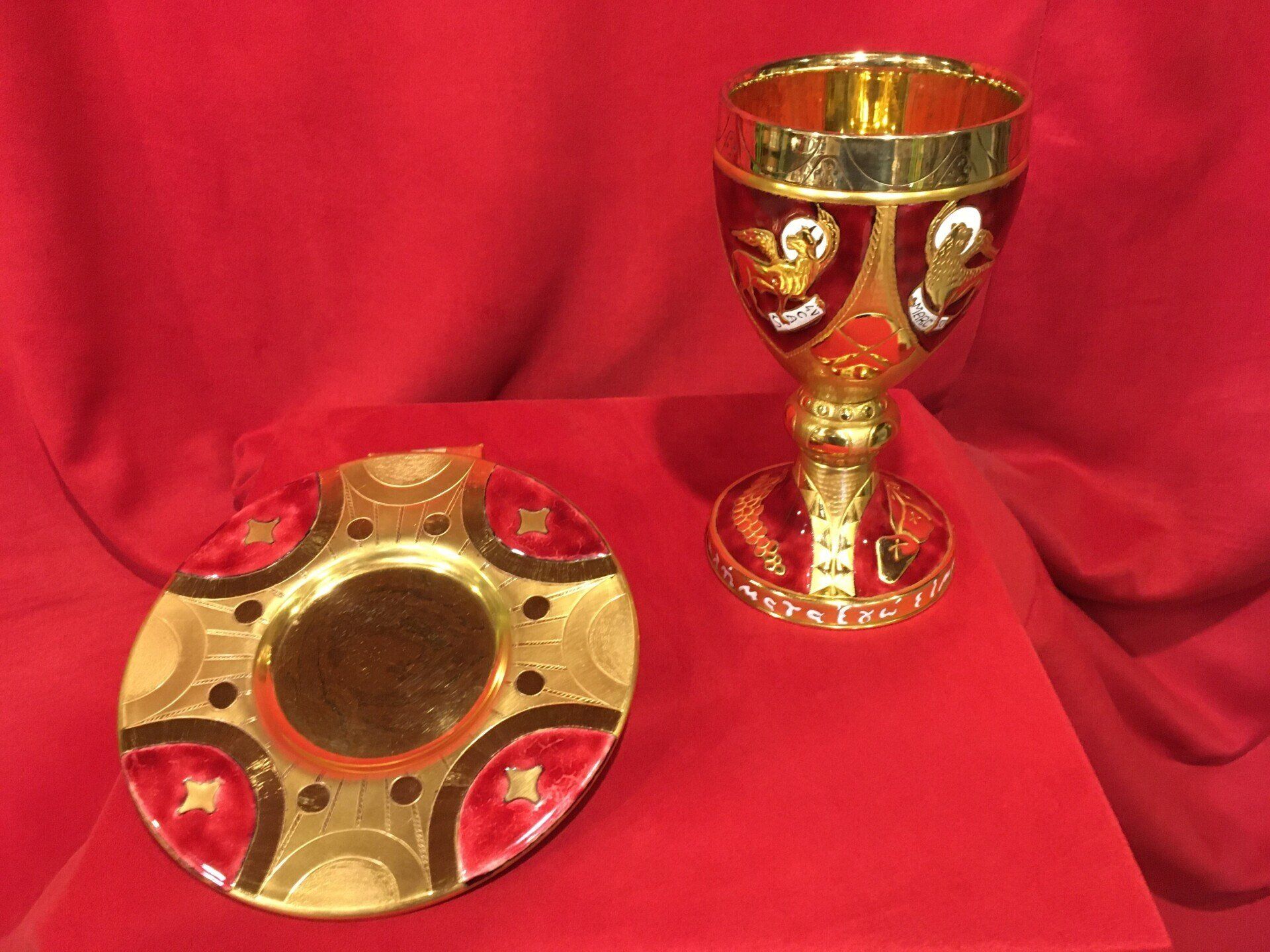 In rame sbalzato a mano, ricoperta d'oro zecchino con smalti purpurei si presenta la Patena del diametro di 18.0 cm. Quattro lunette in smalto rosso contenenti ciascuna al centro una stella aurea delimitano e tratteggiano una croce greca. Dal cerchio interno, atto a contenere l'ostia grande del celebrante, una leggera raggiera sbalzata a cordoncino con otto piccole sfere, impreziosisce e illumina la croce.